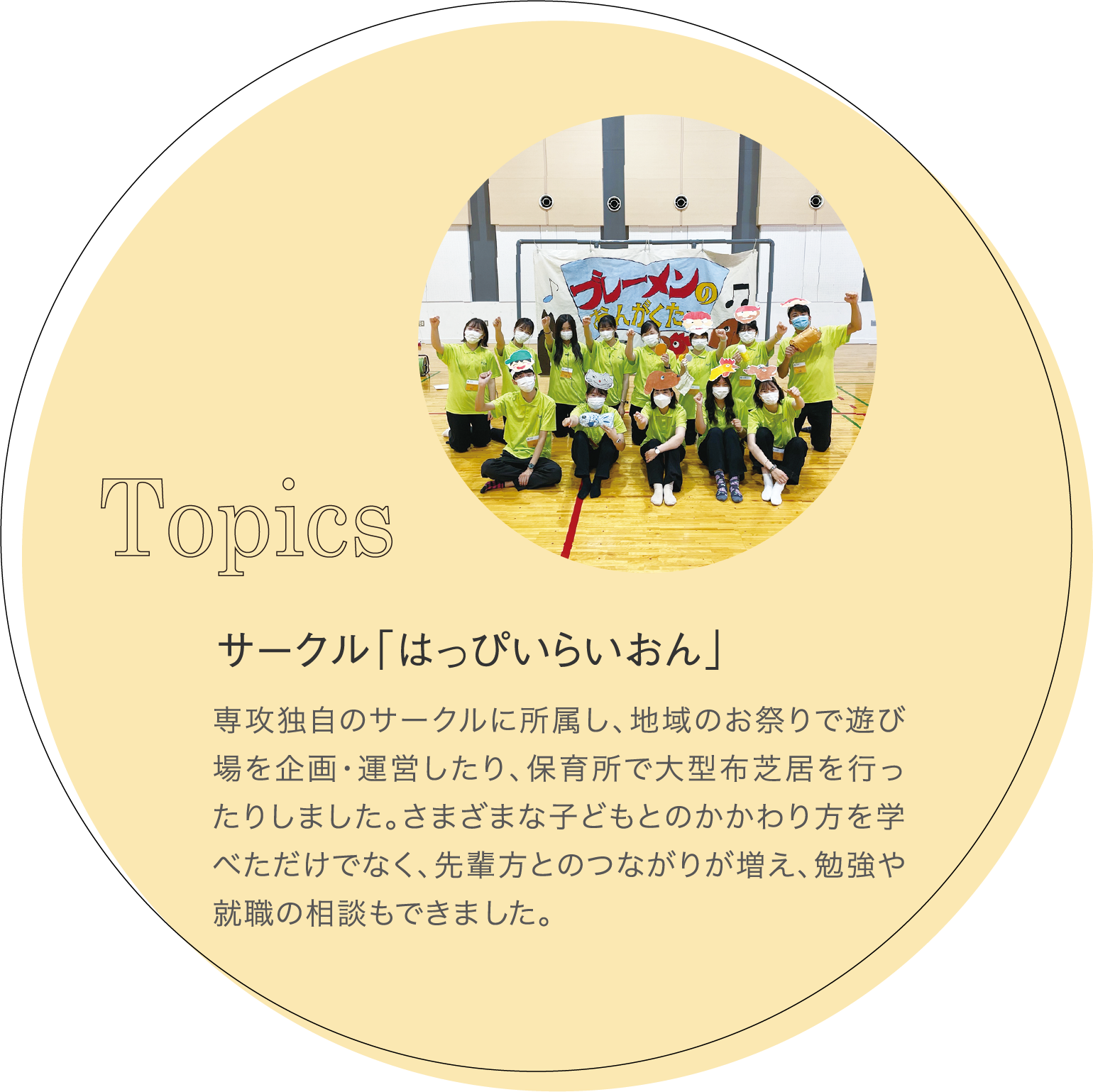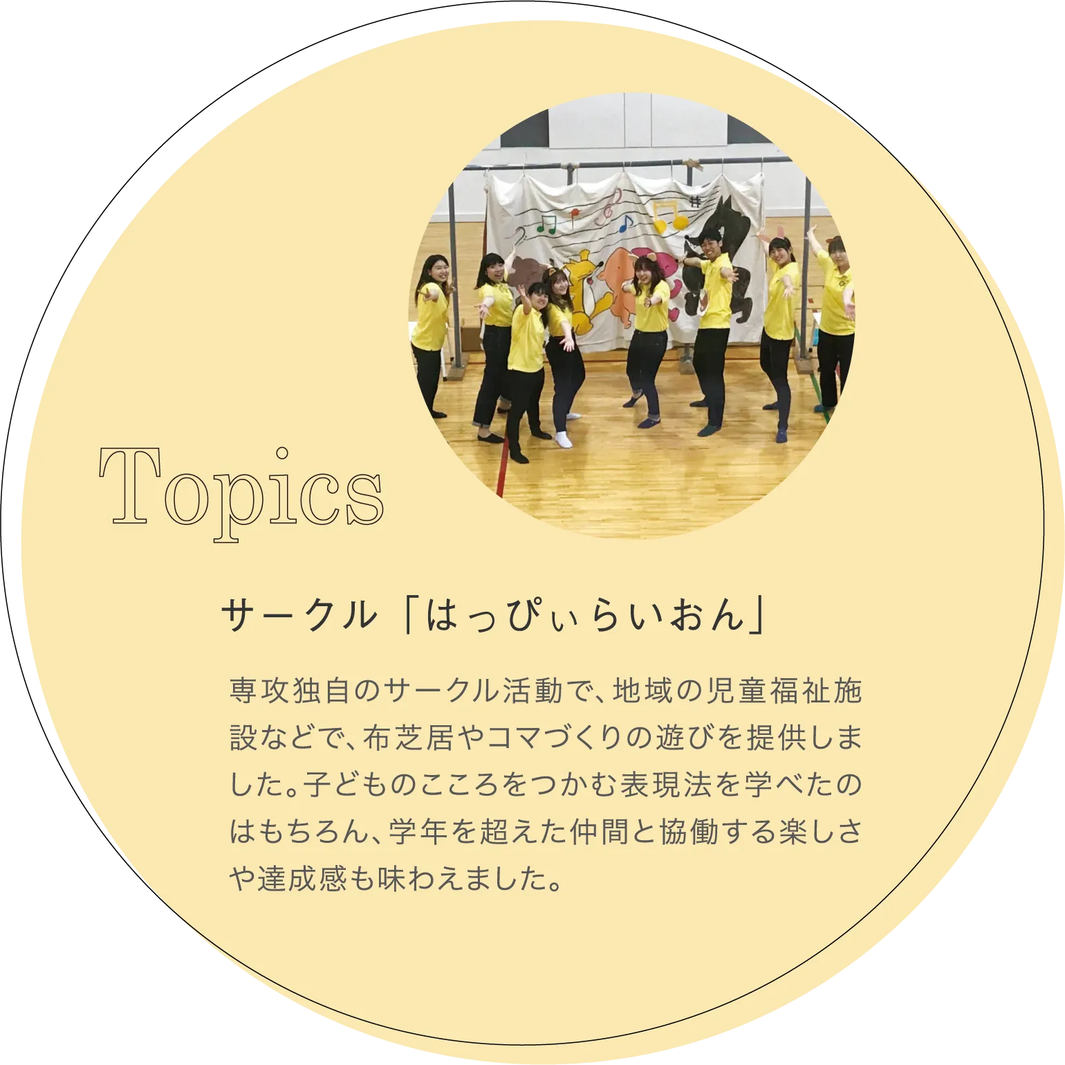 1年次は保育の意義や子どもの発達、保健、福祉など、子どもと保育に関する基礎知識を、主に講義で学びました。「子どもと環境」の授業では、実際の保育現場の映像を見た後、グループで保育環境づくりを実践。安全性に配慮した棚や遊具の配置、子どもたちが集中しやすい保育者の立ち位置など、一つひとつに意味があることを学びました。また、サークル「はっぴぃらいおん」の活動や学生主体のイベント「遊びの交流会」では、たくさんの子どもたちと交流しました。最初は緊張しましたが、先輩の動きや言葉がけを参考にすることで、年齢や性格に応じたかかわり方が少しずつわかってきました。